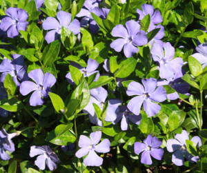 Vinca minor often referred to as periwinkle or creeping myrtle is a trailing ground cover.